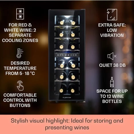 For all connoisseurs of fine wines: the Klarstein Shiraz 29 Duo wine refrigerator offers stylish storage space and ideal cooling for wine, sparkling wine and other drinks.