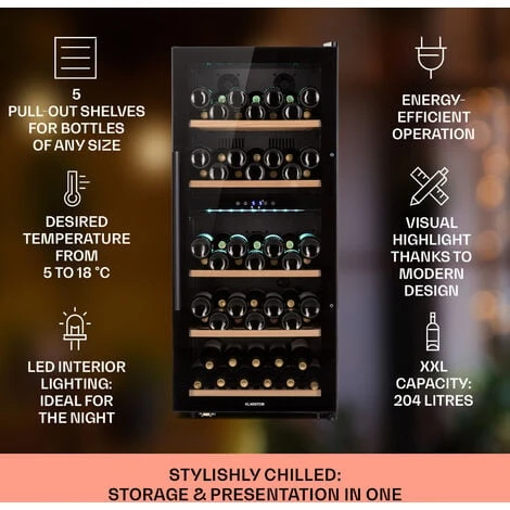 Always at the perfect temperature: Owing to two different cooling zones, you can always have the perfect wine at the right time with the Klarstein Barossa 79 Duo wine refrigerator. In the upper and lower temperature zones of the Klarstein Barossa 79 Duo wine cooler , up to 79 bottles of wine are cooled with pinpoint accuracy on five removable wooden shelves. The glass front with panorama window made of safety glass ensures a stylish presentation of the wine treasures. The switchable interior lighting skilfully sets the scene for the bottles stored inside.