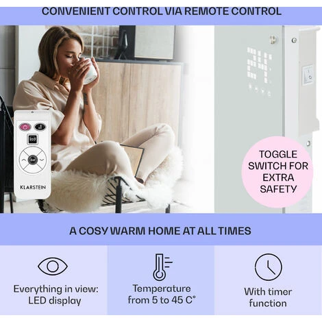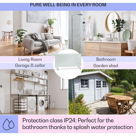 Early in the morning when brushing your teeth or after a bath, the body is enveloped with warmth, as the glass panel of the Klarstein Bornholms is splash-proof and can therefore be placed also in damp areas.
