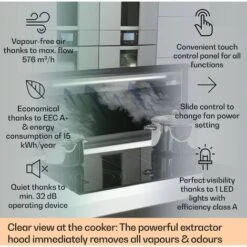 ‘More light!’: not just Goethe’s last words, but also the credo of our hoods. With two bright and low-consumption LED hob lights, the Klarstein Contempo Neo cabinet hood also eliminates dim lighting conditions. This way, you can always see what is brewing in the pots and pans. Power levels and light are switched on easily via the SenseControl touch control on the front of the hood. On top of that, the black acrylic glass panel adds an extra touch of luxury to the otherwise brushed stainless steel case.