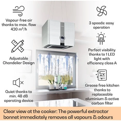 Free-hanging: ceiling-mounted island hood with 200-watt motor power