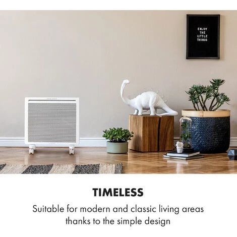 The 1000 watt heating element can be continuously adjusted between 5 and 45 ° C and can therefore be optimally adapted to individual heating requirements. The 46 x 40 cm heating panel can be attached directly to the wall or used as a mobile standing device. Two stable feet, each with two rollers, and a 145 cm long cable ensure the necessary mobility. With 1000 watts of power, it heats rooms up to 20 m² in size without any problems. A weekly timer enables the heating times to be programmed as required for each day of the week – so a pleasantly warm room is always guaranteed. In addition, the OpenWindow Detection ensures automatic shutdown when the window is open. All settings can be made directly on the heater’s control panel. Thanks to its clear LED display, you always have an overview of the current settings. An adjustable child safety device, which prevents accidental switching or switching on, as well as an integrated overheating protection provide additional safety. The Klarstein Hot Spot Slimcurve Double Wave heater not only shines in terms of technology, it also impresses with its stylish design: the rounded edges and shiny surface exude cosy warmth as well as a touch of luxury.