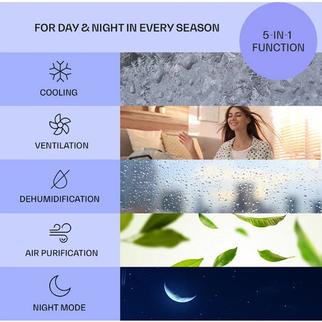 ULTIMATE 5-IN-1 AIR COOLING: This portable air conditioner unit gives heat the cold shoulder with 5 powerful modes: cooling, night mode, ventilation, dehumidification and air purification. Easy-gliding wheels give freedom to move from room to room.
