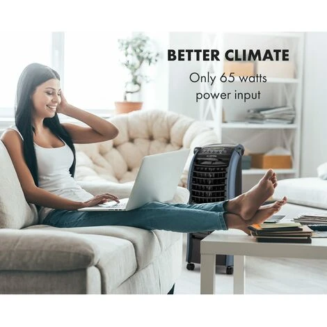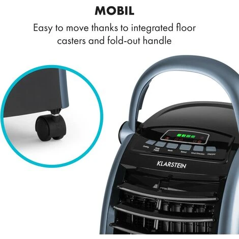 Boundlessly refreshing: Thanks to the fold-out handle and integrated floor castors, the Klarstein Maxfresh Ocean air cooler is completely mobile and sprays a fresh, cool breeze everywhere.