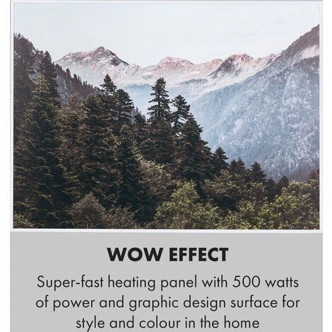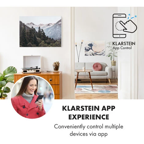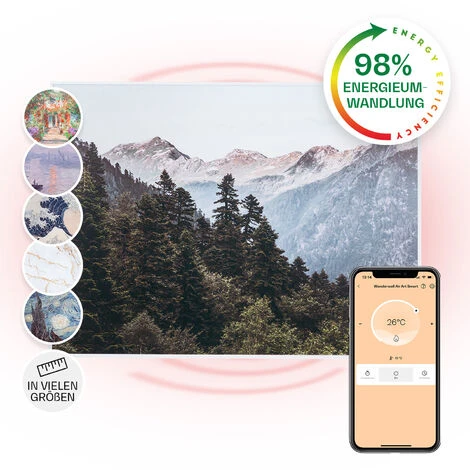 The Klarstein Wonderwall Air Art Smart infrared heater combines highly efficient heating power with attractive design and the latest technology. The 80 x 60 cm heating panel can be hung directly on the wall, is only 5 cm high and hardly bigger than a framed picture. With its powerful 500 Watt output and owing to IR ComfortHeat it spreads very pleasant heat for the human skin without getting lost in the air. Thanks to infrared technology, the heating panel is extremely energy-efficient and environmentally friendly, as a full 98 % of the power is converted into radiant heat. Smart functions for control via app, thermostat, auto switch-off function and IP44 protection class skilfully round off the innovation.